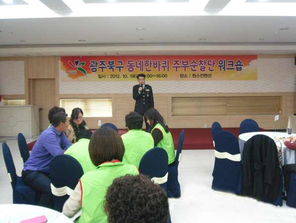 광주북부경찰서 우산지구대는 최근 광주 북구청 주관으로 실시한 동네한바퀴 주부순찰단 워크숍에 참석, 지역방범활동에 중요한 위치를 차지하는 주부 순찰단의 적극적인 활동을 당부했다. /광주북부경찰서 우산지구대 제공