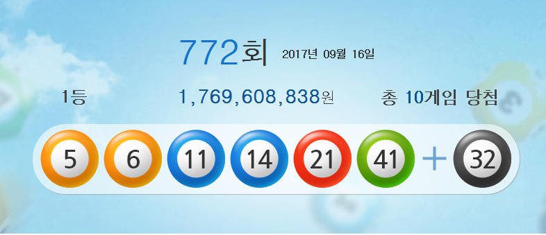 772회 나눔로또 추첨결과 로또 1등 당첨번호는 ‘5, 6, 11, 14, 21, 41’ 이며 2등 보너스 번호는 ‘32’ 으로 발표됐다.