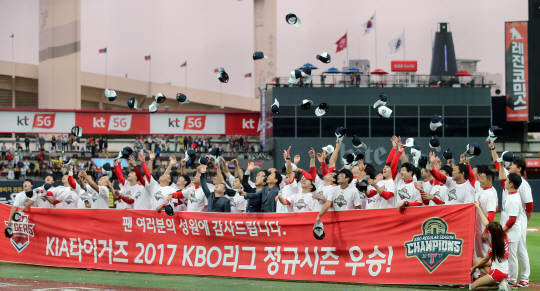 이날 승리로 정규리그 자력 우승에 필요한 매직넘버 ‘1’을 지운 KIA는 87승 1무 56패(승률 0.608)를 올려 시즌 막판 무서운 추격전을 벌인 2위 두산 베어스(84승 3무 57패)를 승률에서 따돌리고 올해 KBO리그 정규리그 1위를 확정했다.