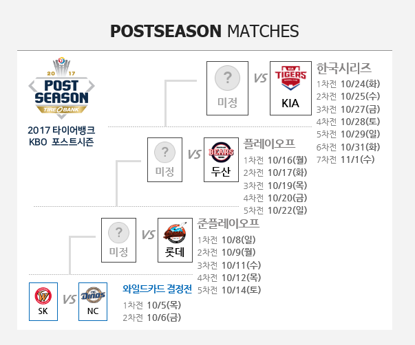 2017 포스트시즌은 오는 5일 6일, NC-SK의 와일드카드 결정전을 시작으로 11월 1일까지 이어진다.