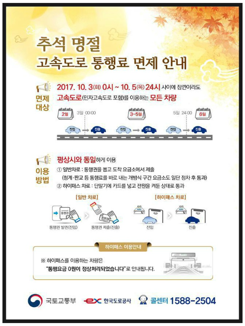 5일 자정까지 고속도로에 진입해서 6일 진출하는 차량 역시 통행료가 면제된다.