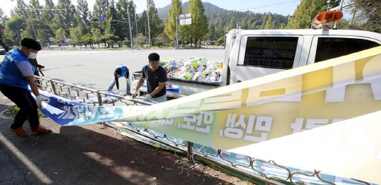 광주광역시 북구청 광고물관리팀 직원들이 최근 용전동의 한 도로변에서 추석연휴기간 무분별하게 설치돼 도시미관을 해쳤던 명절환영현수막과 아파트분양광고 현수막을 제거하고 있다. /광주 북구 제공 동구, 그린실버피아페스티벌 성료