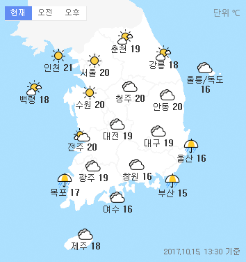 15일 전국에 구름이 많고 제주도와 광주 전남 그리고 프로야구 준플레이오프 5차전이 열리는 부산과 경남지역에 빗방울이 떨어지고 있다.