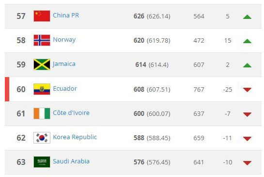 이란 34위, 호주 43위, 일본 44위, 월드컵에 탈락한 중국 57위