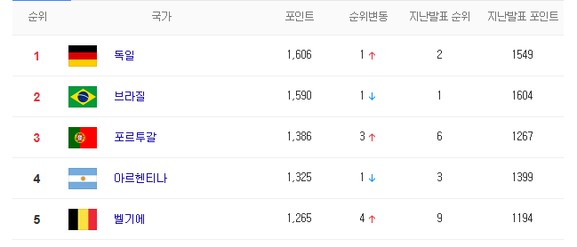 지난달과 같이 독일이 1위를 유지했고 다음으로 브라질, 포르투갈, 아르헨티나, 벨기에 등이 뒤를 이었다.