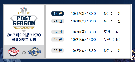 프로야구 두산과 NC의 2017 프로야구 한국시리즈 진출을 위한 5전 3선승제의 플레이오프 1차전이 오늘 시작한다.
