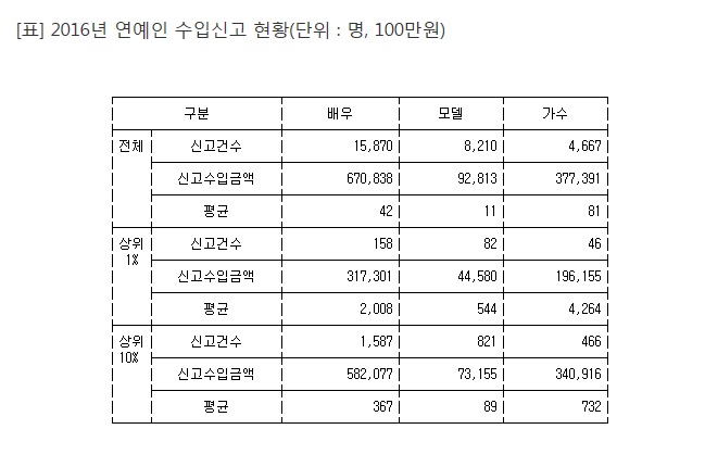 2016년 연예인 수입신고 현황에 따르면 연예인의 수입이 극과극의 차이를 보였다.