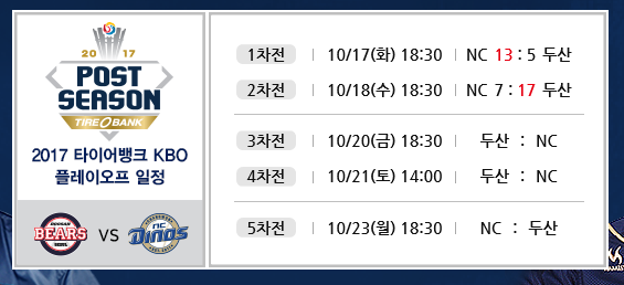 프로야구 두산 베어스와 NC 다이노스의 2017 KBO 플레이오프 3차전이 내일 오후 6시 30분 NC 다이노스의 홈구장인 창원 마산구장에서 열린다.