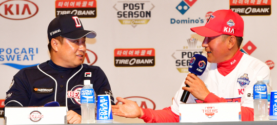 24일 광주광역시 북구 전남대학교 용지관에서 열린 KBO 한국시리즈 미디어데이에 참가한 양팀 사령탑과 대표 선수들은 서로를 예우하면서도 한국시리즈 진출에 대한 열망을 드러냈다. 이날 행사에는 KIA의 김기태 감독과 양현종, 김선빈, 두산의 김태형 감독과 유희관, 오재일이 참석했다.