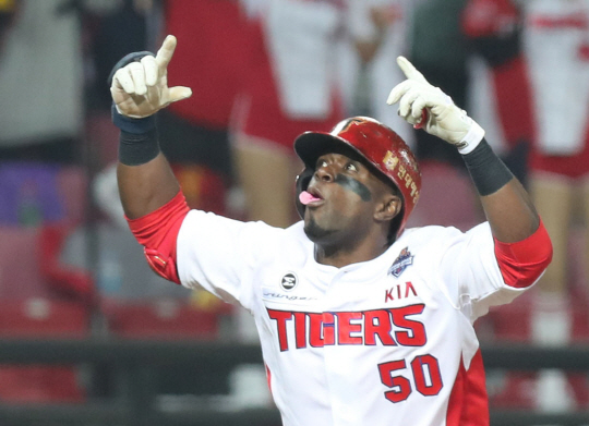 KIA 타이거즈는 5회말 공격에서 김선빈의 좌전안타와 김주찬의 볼넷으로 1사 1,2루 기회를 잡아 로저 버나디나가 니퍼트의 낮은 체인지업을 잡아 당겨 우월 3점포를 터뜨렸다.