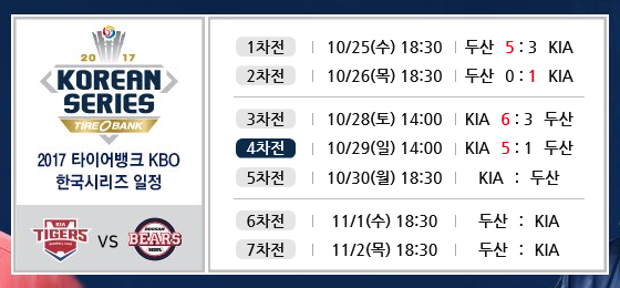 기아 타이거즈와 두산 베어스의 한국시리즈 5차전은 30일 오후 6시 30분 잠실구장에서 열린다.
