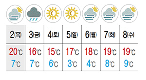광주지방기상청에 따르면 2일 광주·전남은 대체로 흐리지만 기온은 전날과 비슷해 포근하겠다. 낮과 밤의 기온차가 10℃ 안팎으로 벌어져 건강관리에 유의해야 한다. 아침 최저기온은 2~10℃, 낮 최고기온은 17~20℃ 가 되겠다.