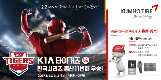 금호타이어는 KIA 타이거즈의 11번째 우승 기념일환으로오는 11일부터 전국 금호타이어 대리점에서 금호타이어 4본을 구매하는 고객에게 헤지스 고급 머플러를 증정한다. 대상 제품은 PCR(승용차용) 마제스티 솔루스(KU50), 솔루스 TA71과 SUV용 크루젠 HP71, 크루젠 프리미엄(KL33) 등이다.