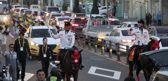 성화는 어제(2일) 오후 제주시 고마로에서 제주도 자치경찰단 기마대원들의 성화 봉송에 이어 오늘 낮 12시 10분에는 성산읍 광치기 해변에서 별도의 성화로 유네스코 인류무형문화유산에 등재된 제주해녀 문화를 느낄 수 있는 이색 봉송이 펼쳐진다.