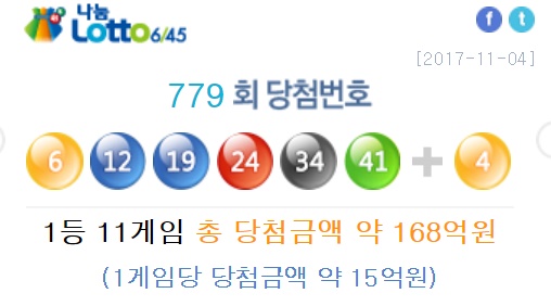 779회 로또당첨번호 ‘6, 12, 19, 24, 34, 41’이고 2등 보너스번호 4