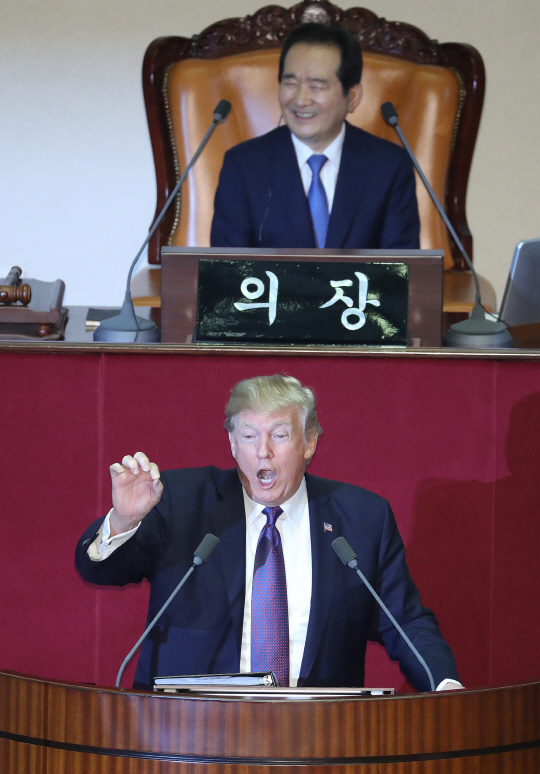 한국을 국빈방문 중인 트럼프 대통령은 이날 국회 연설에서 “북한 체제는 미국의 과거를 유약함으로 해석했지만, 이는 치명적 오산이 될 것이다. 우리는 과거 행정부와 다른 행정부다. 오늘 나는 한미 양국뿐 아니라 모든 문명국을 대신해 북한에 말한다”며 이같이 경고했다.
