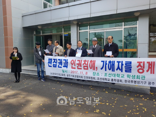 8일 조선대학교 총학생회와 (사)한국인권교육원 등 4개 단체는 조선대학교 학생회관에서 기자회견을 갖고 “인격 무시 발언을 일삼고 편집권을 침해한 해당 교직원을 징계하라”고 주장했다. 이들 단체는 “민주주의를 배우고 가르치는 대학에서 지위를 이용해 직원이 학생들의 편집권과 인권을 침해한 행위는 ‘갑을문화의 적폐’”라며 “논란에 대해 철저한 조사와 가해자를 엄중하게 징계해야 한다”고 강조했다.