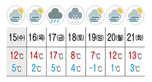 광주지방기상청에 따르면 15일 광주·전남은 찬 대륙고기압의 영향으로 바람이 강하게 불어 체감온도가 낮아 춥겠다. 아침 최저기온은 1~7℃, 낮 최고기온은 11~14℃ 가 되겠다.