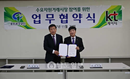27일 환경공단에 따르면 안용훈 공단이사장과 오기섭 케이티(KT) 전남본부 법인단장은 이날 오전 환경공단에서 기후변화 대응과 에너지 절약 나눔 실천을 위한 ‘전력 수요자원 거래시장 참여 협약’을 체결했다.