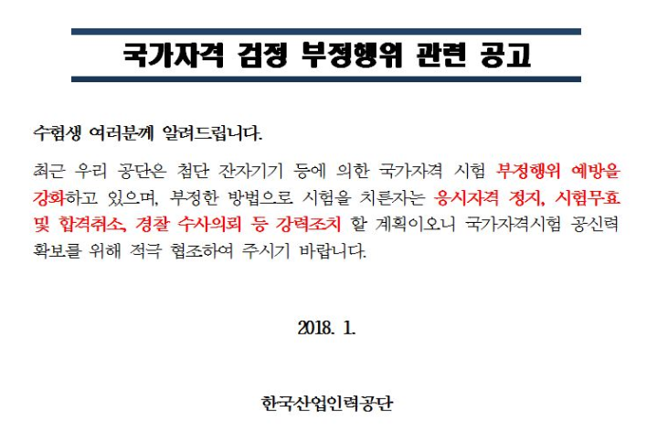 이 같은 공단의 방침에 따라 자격 검정 시 부정행위 단속이 더욱 강화될 것으로 예상한다.