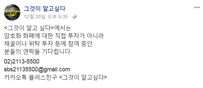 '그것이 알고 싶다' 측은 가상화폐 비트코인에 대한 제보를 받고 있다고 공지했다.