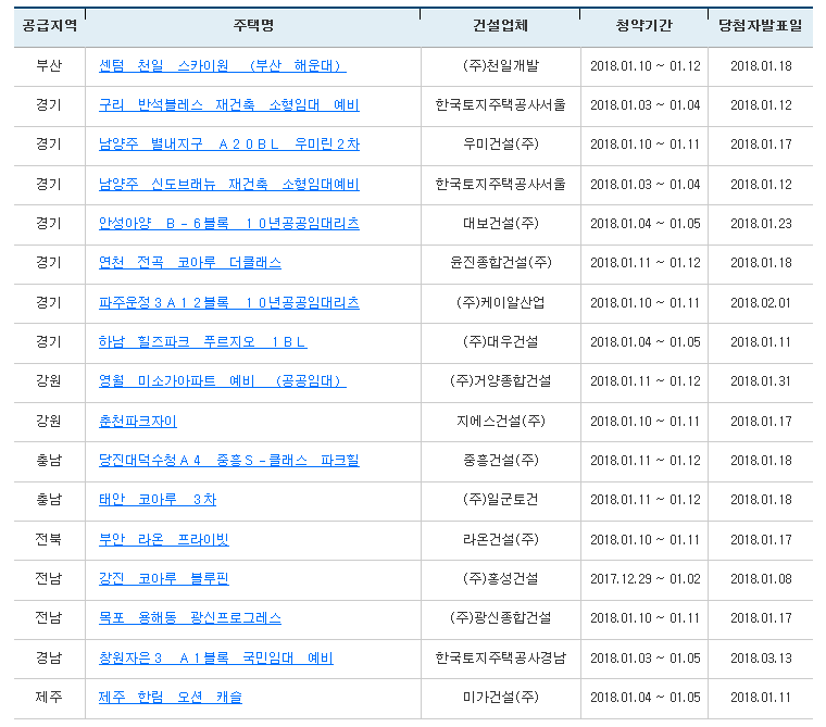 각 단지별 청약 당첨자 발표는 충남 당진 대덕 수청A 4 중흥 S-클래스와 ‘부산 해운대 센텀 천일 스카이원’은 18일, ‘남양주 별내지구 A20BL 우미린2차’와 ‘춘천파크자이’ ‘부안 라온 프라이빗’ ‘목포 용해동 광신프로그레스’는 17일, ‘파주운정 3A 12블록 10년공공임대리츠’는 다음달 1일 진행된다.
