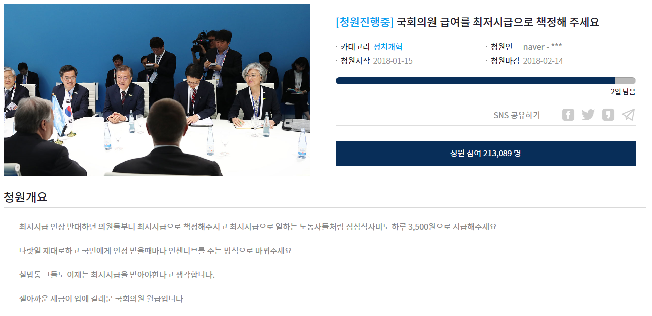 지난 1월 15일 청와대 국민청원 게시판에 게시된 '국회의원 급여를 최저시급으로 책정해 주세요'라는 제목의 청원글이 청원 마감 이틀을 앞두고 청와대 공식답변 조건을 충족했다.