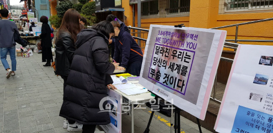민우회는 이날 오후 광주광역시 동구 충장로우체국 앞에서 ‘민우액션 Me Too&With You’ 캠페인을 펼쳤다. 이번 행사는 성폭력 피해자가 사실을 말해도 ‘사실적시에 의한 명예훼손죄’가 성립될 수 있다는 현행법 폐지를 촉구하고, 고용노동부 성평등 전담 근로감독관 확충을 위해 마련됐다.