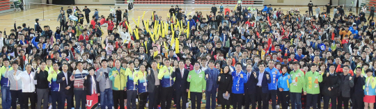 8일 오전 광주여자대학교시립유니버시아드체육관에서 ‘제5회 남도일보 배드민턴대회’ 개회식이 열렸다. 이날 김성의 남도일보 사장과 김응식 광주시체육회 수석부회장, 홍성길 광주시배드민턴협회장, 박상준 광주시북구배드민턴협회장, 최경환 국회의원, 박남언 서구 부구청장, 문상필 시의원, 동호인 등이 기념촬영을 하고 있다. /임문철 기자 35mm@namdonews.com