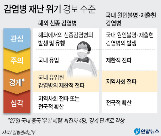 정부가 ‘우한폐렴’으로 불리는 신종 코로나바이러스 감염병 위기 경보 수준을 기존 ‘주의’에서 ‘경계’ 수준으로 격상시켰다. 이에 따라 보건복지부는 신종 코로나바이러스 감염증 중앙사고수습본부를 설치하고 보다 적극적 대응에 나선다.