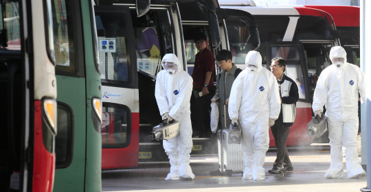 ‘우한 폐렴’우려가 이어지고 있는 28일 오후 광주종합버스터미널에서 서구보건소 긴급방역반원들이 우한 폐렴 예방 및 확산방지를 위해 특별방역을 하고 있다. /임문철 기자 35mm@namdonews.com