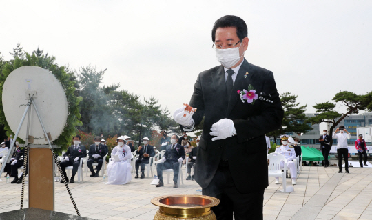 전라남도와 목포시는 6일 목포시 부흥산 현충공원에서 ‘제65회 현충일 추념식’을 개최했다. ‘코로나19’의 지역사회 확산 방지를 위해 행사규모는 대폭 축소된 체 진행됐다.