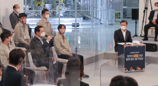 문재인 대통령이 29일 광주광역시 광산구 광주글로벌모터스에서 열린 ‘광주글로벌모터스 준공 기념행사’에서 박광태 광주글로벌모터스 대표(오른쪽), 이용섭 광주시장 등과 이야기를 하며 공장을 둘러보고 있다. /연합뉴스