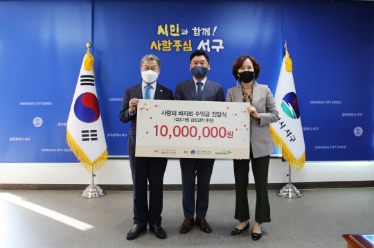 (주)광주신세계는 지난 5일 광주시 서구청장실에서 지역 내 힘든 소외계층을 위한 ‘김장김치 후원금 1천만원 전달식을 가졌다. /광주신세계 제공