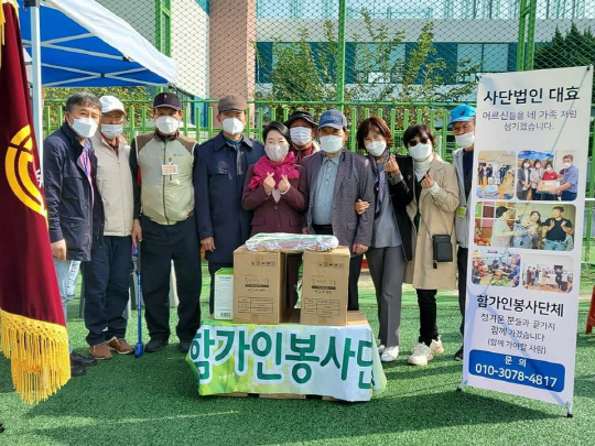 사회복지법인 대효와 함가인봉사단은 6일 광주 서구 염주체육공원에서 열린 대한노인회 광주 남구지회 행사에서 어르신들에게 롤케이크와 산도, 마스크 등을 전달하는 봉사활동을 펼쳤다./함가인봉사단 제공