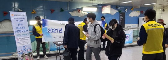 광주도시철도공사는 8일부터 3일간 실시되는 ‘재난대응 안전한국훈련’을 앞두고 최근 광주송정역 등 각 역에서 안전홍보 캠페인을 펼쳤다. /광주도시철도공사 제공