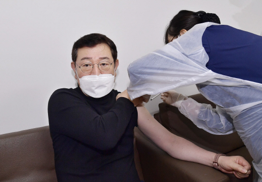 이용섭 광주광역시장(왼쪽)이 9일 오전 서구 한 병원에서 화이자 백신으로 코로나19 3차 추가 접종을 하고 있다. 이 시장은 “전국 확진자가 연일 7천명을 넘어서는 엄중한 상황에서 코로나19 확산을 차단하는 최선의 방법은 백신 접종”이라며 “자신과 공동체의 안전을 위해 백신 접종에 적극 참여해달라”고 당부했다. /광주시 제공
