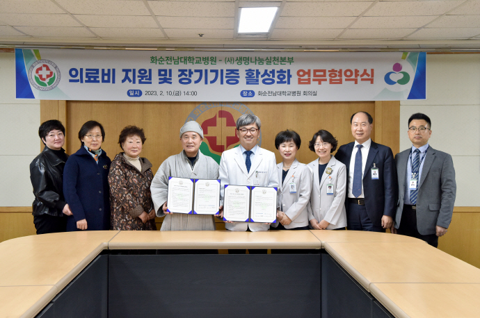 화순전남대병원은 최근 병원 5층 회의실에서 정용연 병원장과 생명나눔실천본부 광주·전남지역본부장 현지 스님 등 양 기관 관계자들이 참석해 ‘취약계층 의료비 지원과 장기기증 문화확산’을 위한 업무협약을 체결했다고 14일 밝혔다.