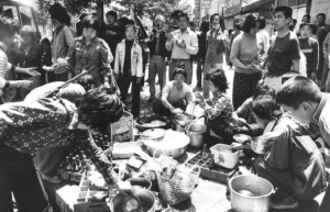 ◇무차별 폭력에 칼·송곳 들고 대항상가 안까지 공수들이 들이닥쳐 겨우 담을 넘어 피신한 윤상원은 공수들이 사라지자 다시 한일은행 사거리로 나왔다. 공수들이 쓰러져 피범벅이 된 사람들의 다리 발목을 잡고 질질 끌고 가 둘이서 다리와 손을 잡고 트럭에 던져 싣고 있었다. 길 한 편에는 잡힌 시위대들의 옷을 벗기고 팬티만 입힌 채, 무릎을 꿇려 이마를 땅바닥에 대도록 하더니 계속 곤봉으로 두들겨 패고 있었다. 이 끔찍한 광경을 본 사람들이 하나둘 모이기 시작하더니 점점 수가 불어나자 구호를 외치기 시작했다.그때 시위대의 선두에서 건장한
