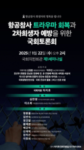 더불어민주당 차지호 국회의원은 22일 오후 2시 국회의원회관에서 ‘항공참사 트라우마 회복과 2차희생자 예방을 위한 국회토론회’를 개최한다고 밝혔다.이번 토론회에서는 차 의원을 비롯해 신정훈 행정안전위원장, 박주민 보건복지위원장 등 국회의원 17명과 국회 생명안전포럼, 국회 건강과돌봄그리고인권포럼이 공동 주최한다.이번 토론회는 12·29 제주항공 여객기 참사 트라우마로부터 남겨진 유가족과 현장인력의 2차 희생을 예방하고, 현행 재난 트라우마 지원시스템의 질적 한계 극복방안을 모색하고자 마련됐다.토론회는 차 의원이 직접 좌장을 맡아 진