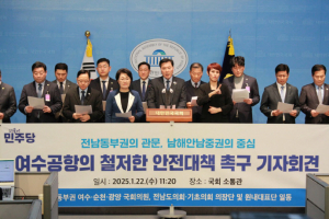 전남 동부권 정치인들이 22일 국회에서 ‘여수공항 안전혁신 대책 촉구’ 기자회견을 개최했다.국회 소통관에서 열린 이날 기자회견에는 더불어민주당 주철현(전남 여수갑)·조계원(여수을)·김문수(전남 순천·광양·곡성·구례군갑)·권향엽(순천·광양·곡성·구례을) 의원과 전남도의원, 각 시의회 의장단과 원내대표단 등이 참석했다.조 의원에 따르면 여수공항은 광양만권 87만 지역민들을 비롯해 연간 5천만명의 관광객이 찾는 전남 동부권의 관문이자, 남해안 남중권의 중심공항으로 자리잡고 있다. 여수공항은 코로나 시기에도 80% 이상의 여객율을 유지하며