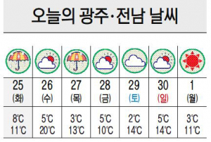25일 수요일 광주와 전남은 흐린 가운데 새벽부터 오후까지 곳곳에 비가 내리겠다.광주지방기상청에 따르면 광주·전남은 중국 발해만 부근에서 동쪽으로 이동하는 기압골의 영향을 받다가 차차 벗어나겠다. 이 영향으로 오후까지 비가 이어지겠으며, 예상 강수량은 5~10㎜다.기온은 평년보다 높겠다. 아침 최저기온은 6~11도, 낮 최고기온은 11~14도로 평년(최저 0~6도, 최고 12~15도)보다 높은 수준을 보일 전망이다.해안 지역은 강한 바람에 유의해야 한다. 전남 해안은 25일 오전부터 시속 70㎞ 이상 강풍이 불 가능성이 있어 강풍특