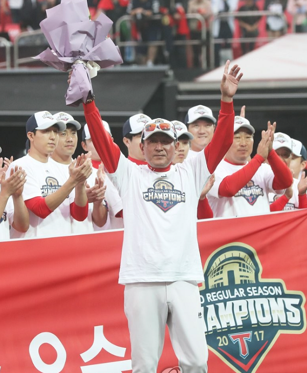 정규시즌 우승을 확정한 기아 타이거즈 김기태 감독이 꽃다발을 높이 들고 인사하고 있다.