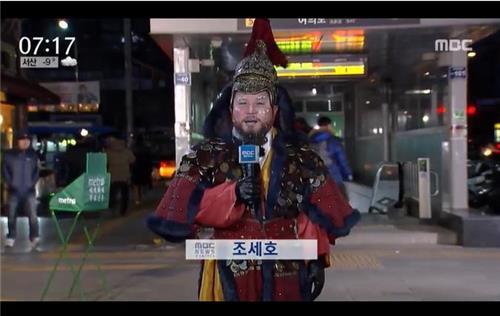 '동장군' 복장으로 등장한 그는 "출근하시는 많은 분과 인터뷰를 해보기 위해 이곳에 서있다"며 "오늘 날씨가 너무 춥다. 기상캐스터 분들이 고생을 많이 하시는 것 같아 박수를 드리고 싶다"고 입을 열었다.