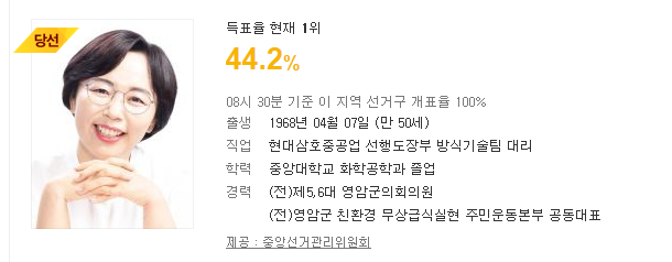 한편 52명을 선출하는 전남도의회 광역의원 지역구 선거에서는 전남 영암군 제2선거구에서 출마한 이보라미 정의당 후보가 44.19% 득표율로 손남일 민주당 후보를 누르고 당선된것으로 확인되면서 화재가 되고 있다.