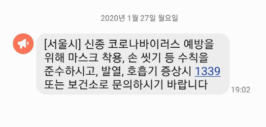 오후 7시께 발송된 이 메시지에는 “신종코로나바이러스 예방을 위해 마스크 착용, 손 씻기 등 수칙을 준수하시고, 발열, 호흡기 증상시 1339 또는 보건소로 문의하시기 바랍니다”라는 내용이 들어 있다.