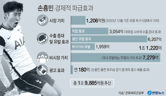 문체부는 21일 “한국스포츠정책과학원과 손흥민의 경제적 파급효과를 분석한 결과 그 규모가 1조9천885억원에 이르는 것으로 추산됐다”라고 밝혔다.