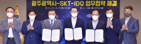 광주광역시는 비대면 디지털 경제의 핵심 보안기술인 양자융합산업 육성을 위해 17일 시청 비즈니스룸에서 SK텔레콤, IDQ와 ‘양자정보통신 생태계 구축 업무협약’을 체결했다.