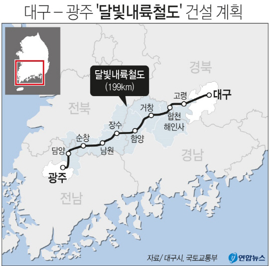달빛 내륙철도는 광주 송정과 서대구 간 노선길이 198.8㎞구간을 잇는 단선 전철 사업으로 사업비는 총 4조5천158억원으로 추산됐다. 광주, 전남(담양), 전북(순창·남원·장수), 경남(함양·거창·합천), 경북(고령), 대구를 지난다.