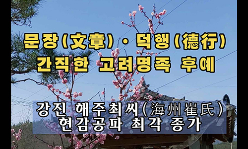 고려조에 9재학당을 열어 ‘해동공자’로 존경받았던 최충이 두아들에게 시로써 남긴 가훈이 ‘계이자시’다. 대대손손 문장과 덕행으로 그의 가르침을 지켜온 해주최씨(海州崔氏)가 강진군 군동면 신기마을에서 집성촌을 이루며 세거하고 있다. 해주최씨 현감공파 최각 종가를 찾아 가문의 내력을 살펴본다. http://www.namdonews.com/news/articleView.html?idxno=602247